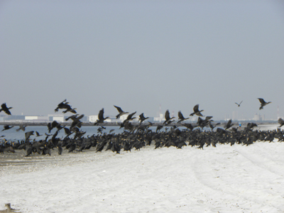 カワウの集団が飛来。上陸中。稲毛海岸の千葉よりの突堤近くを、